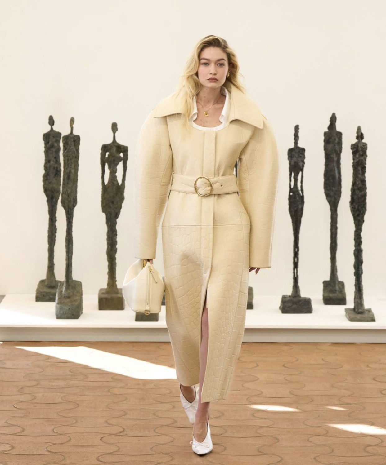 Как следует из названия, коллекция была вдохновлена скульптурами. Открыла показ Джиджи Хадид в пальто цвета яичной скорлупы с рукавами реглан — этот образ задал тон последующим. Далее фигуры Джакометти нашли свое отражение в платьях-колоннах из тонкого джерси и жакетах, дополненным акцентными подплечниками или подчеркнутым талиям.