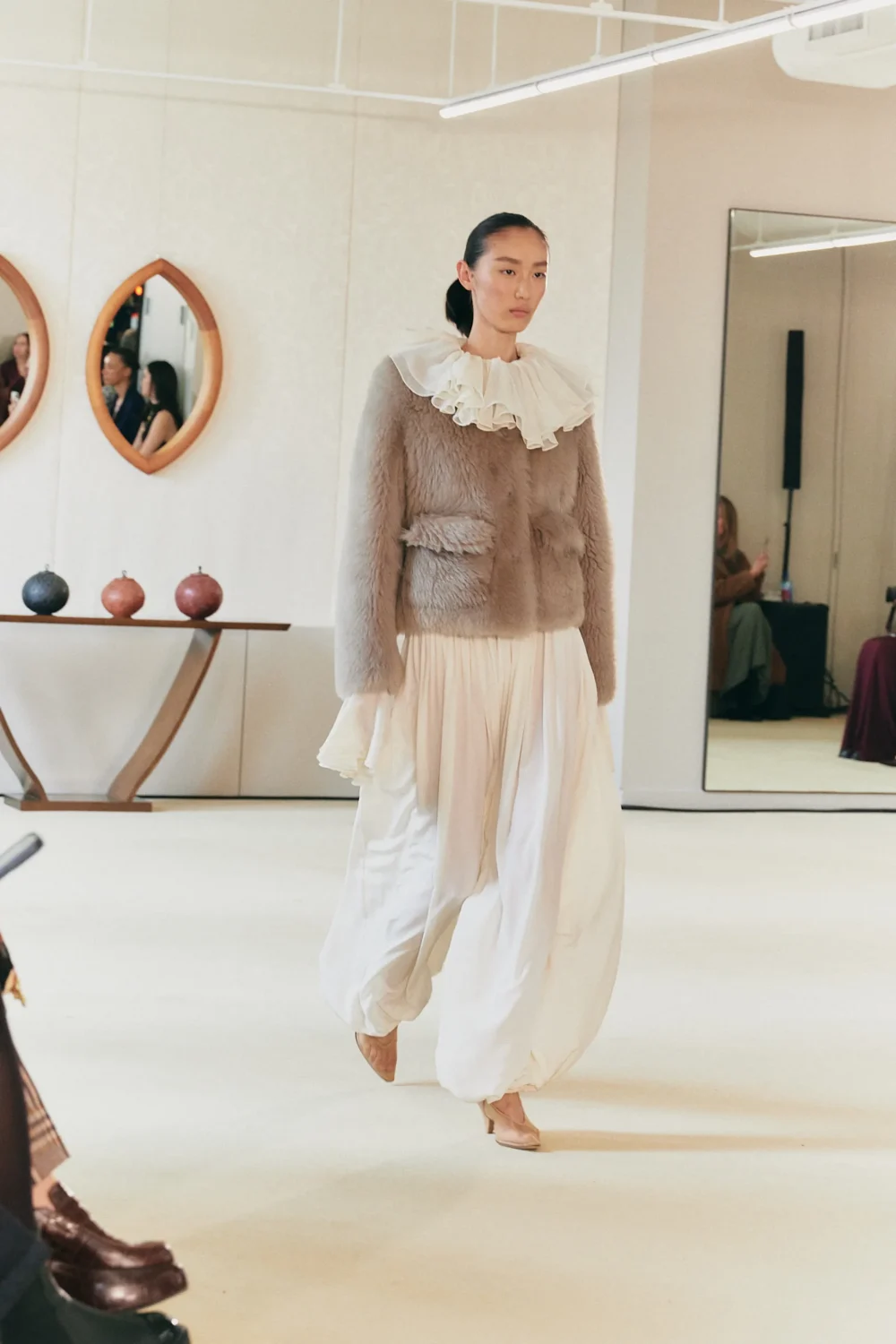 Джозеф Альтузарра напомнил нам, как выглядела мода до эпохи соцсетей — времени, когда показы проходили в уютных шоурумах. Показ прошел в камерной атмосфере штаб-квартиры бренда, а сама коллекция напоминала капсулу времени. Здесь можно было увидеть леди с Верхнего Ист-Сайда в идеально сидящем темно-синем блейзере, гламурную тетушку Дороти в воздушных брюках цвета шафрана, а также героиню из классической литературы в длинном плаще с капюшоном.
