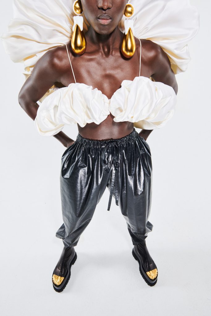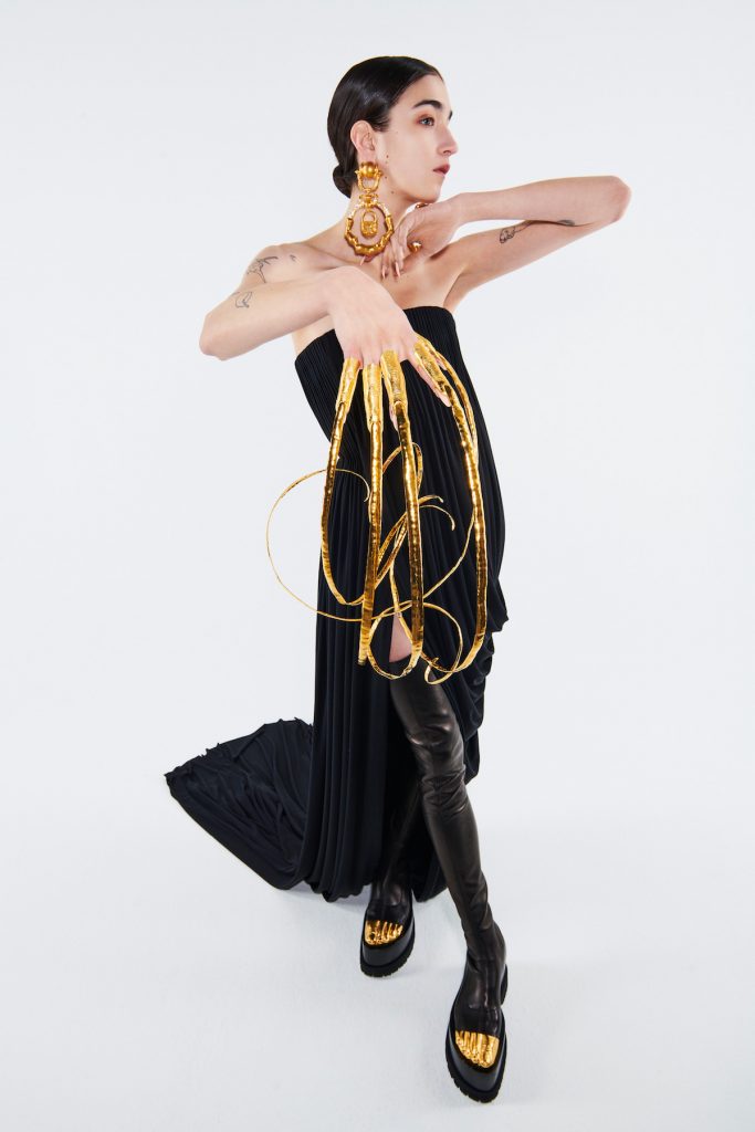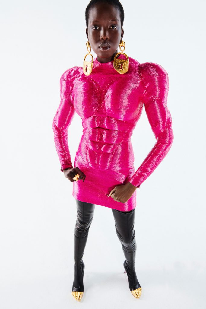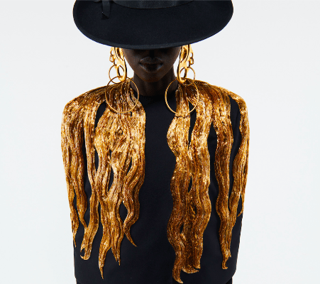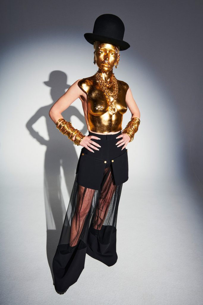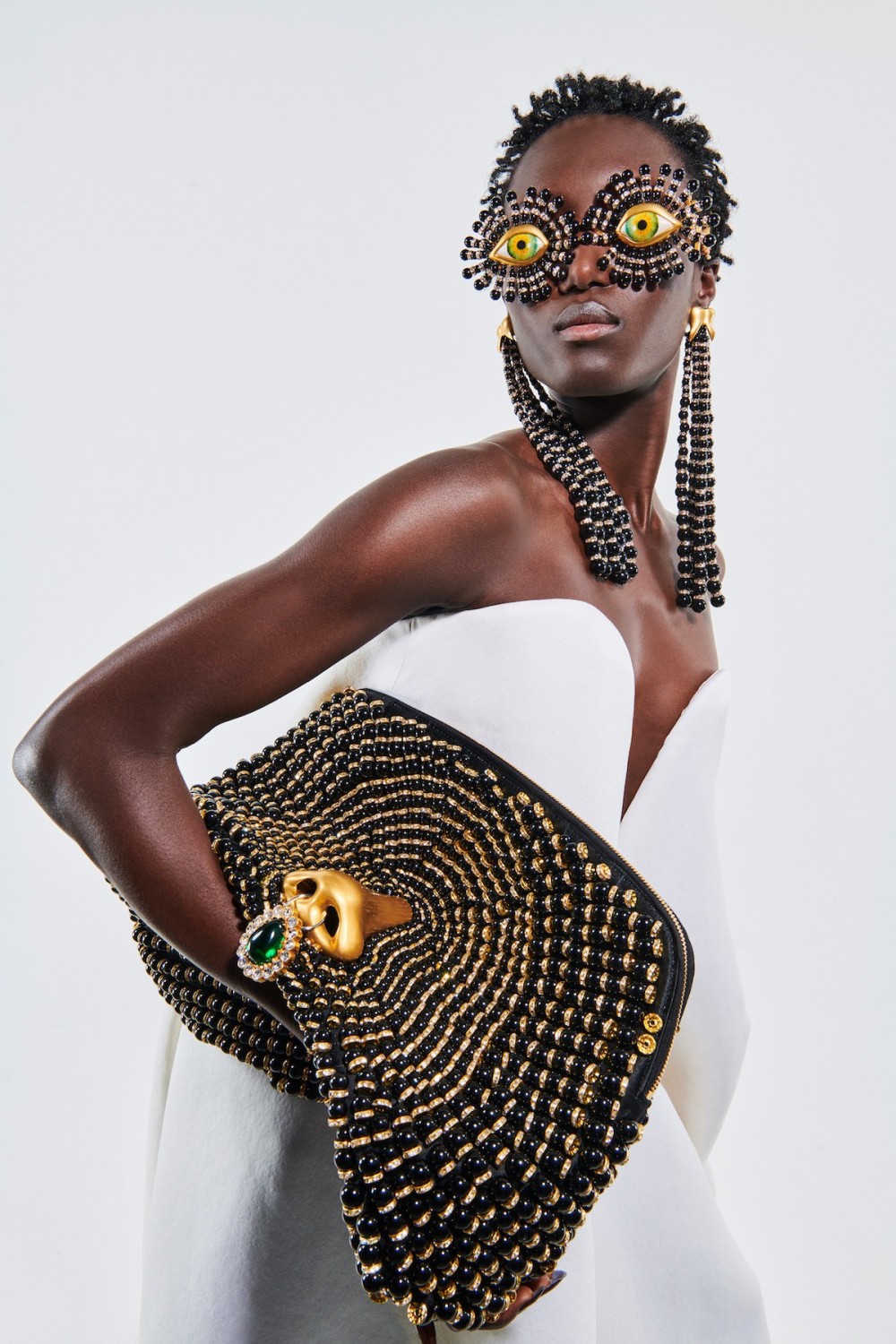 Вдохновение черпалось прямо и косвенно в кодах и образах, изобретенных самой Эльзой Скиапарелли. К примеру, тканая шерстяная накидка, украшенная тысячами золотых стеклярусов, напоминает ее вышитую вуаль с капюшоном 1938 года с иллюзией настоящих волос. В коллекции также присутствует фирменный навесной замок в жестком клатче.