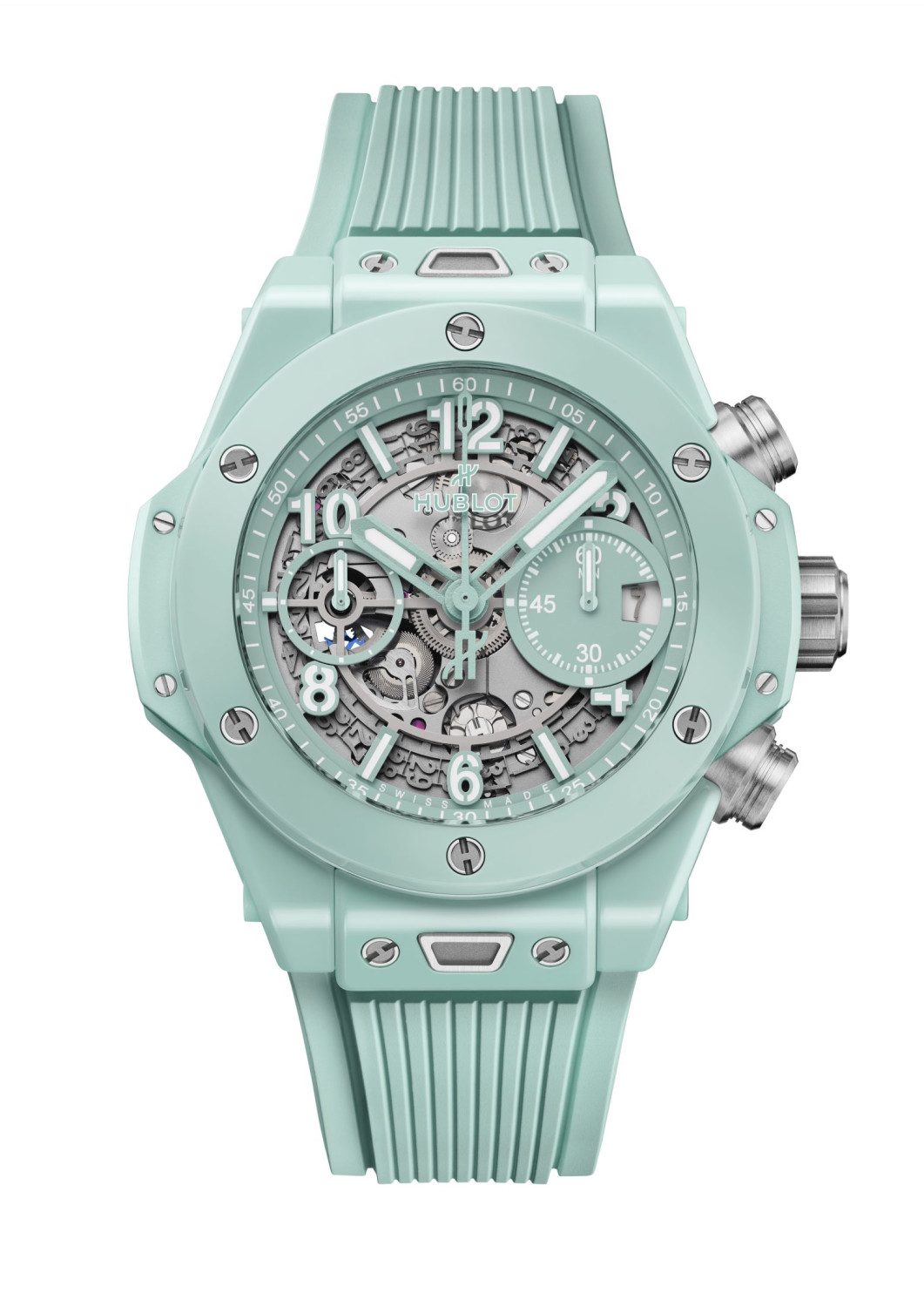 Брутальная нежность из керамики в мятно-зеленом оттенке стала достойным пополнением культовой серии Big Bang. Унисекс-модель BIG BANG UNICO 42 мм с мануфактурным автоматическим калибром хронографа и циферблатом-скелетоном освежает ваш образ и дарит неоспоримое очарование. Кстати, инновационные подвиги Hublot не заканчиваются на этой модели. Ведь новинка также представлена в абсолютно новом цвете морской волны. Да, на такие эксперименты с керамикой и неистовые поиски ее новых оттенков способна только команда Hublot. Кстати, у часов есть младшие братья по размеру в 33 мм Big Bang One Click, инкрустированные бриллиантами.