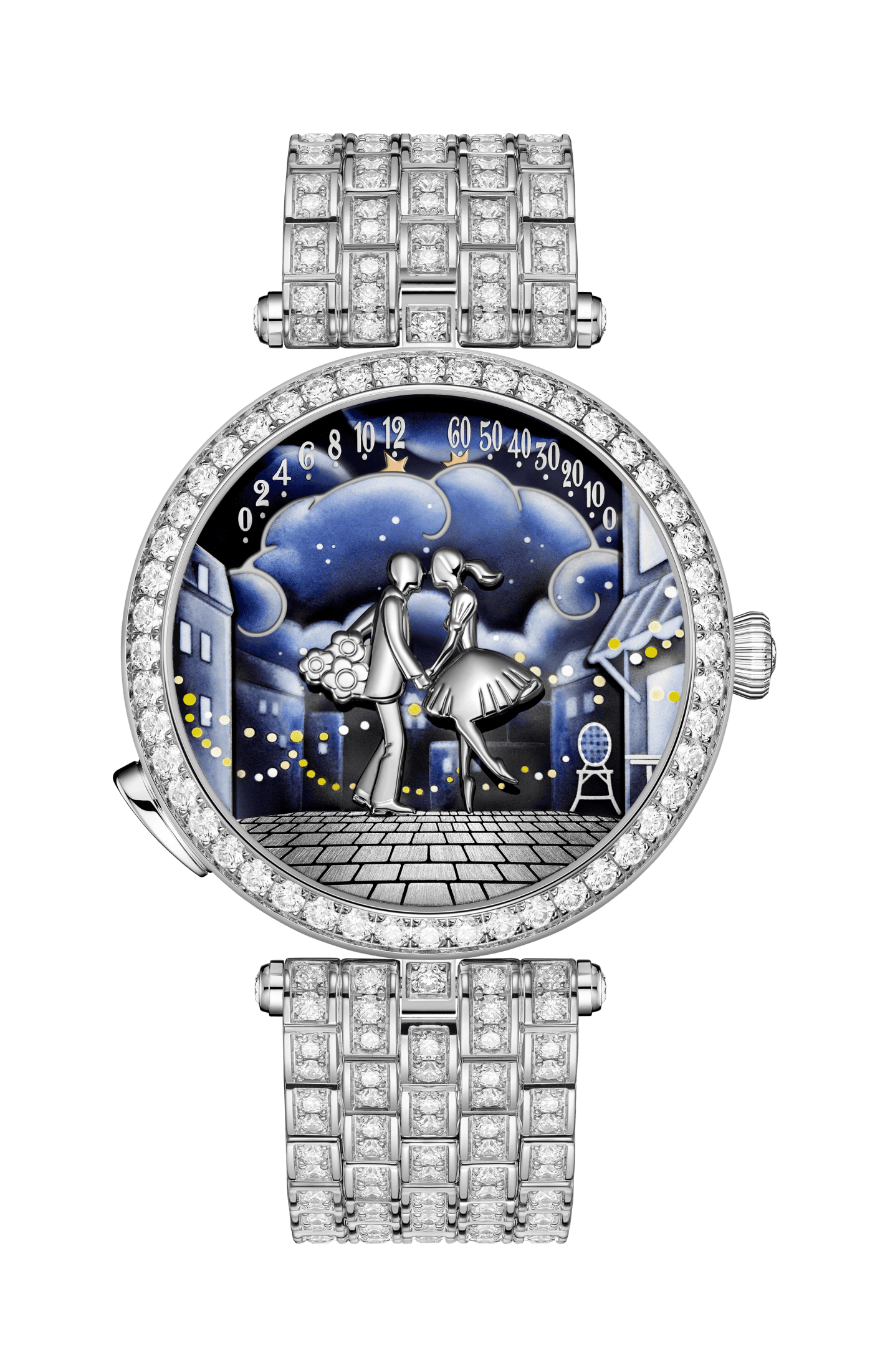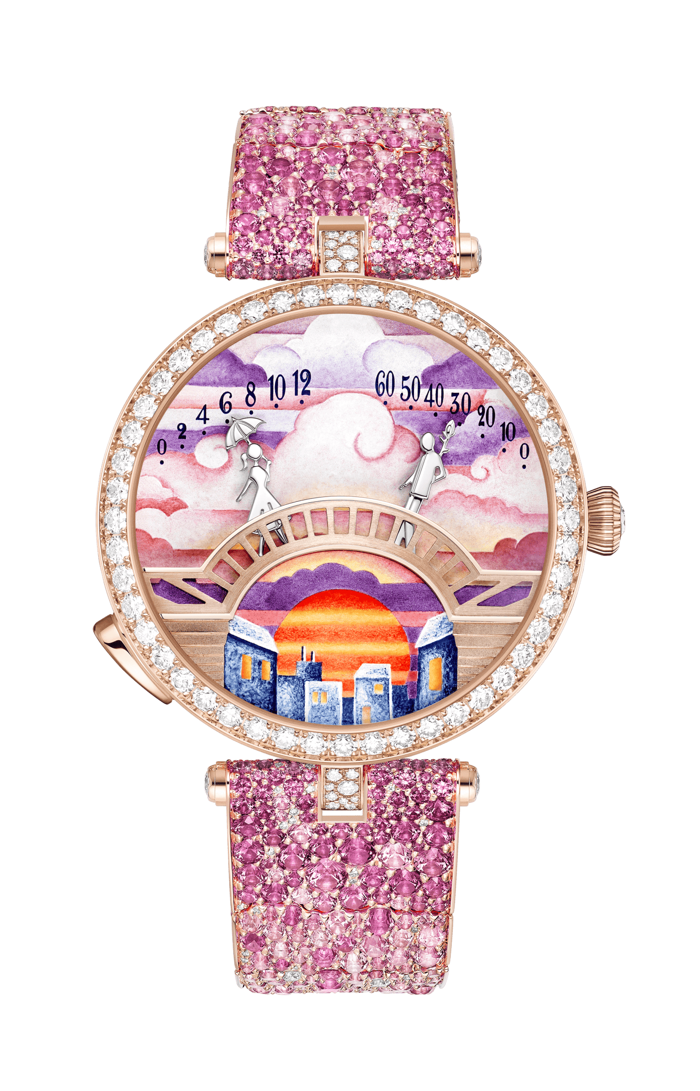 Впервые часовая история тех самых влюбленных на мосту была представлена миру в 2010 году. С тех пор коллекция рассказывает трогательную lovestory мужчины и женщины, которые всегда спешат друг к другу. В этом году были выпущены четыре новые модели с драгоценными браслетами в синем и розовом цветах. Циферблаты Lady Arpels Pont des Amoureux окрашены в нежные оттенки рассвета, утра, заката и лунного света. Каждый шаг наших героев отсчитывает часы и минуты ретроградного механизма. Сближаясь, они дарят друг другу долгожданный поцелуй. Пожалуй, ты не найдешь более романтичных часов. Настоящие вестники не только времени, но и любви!