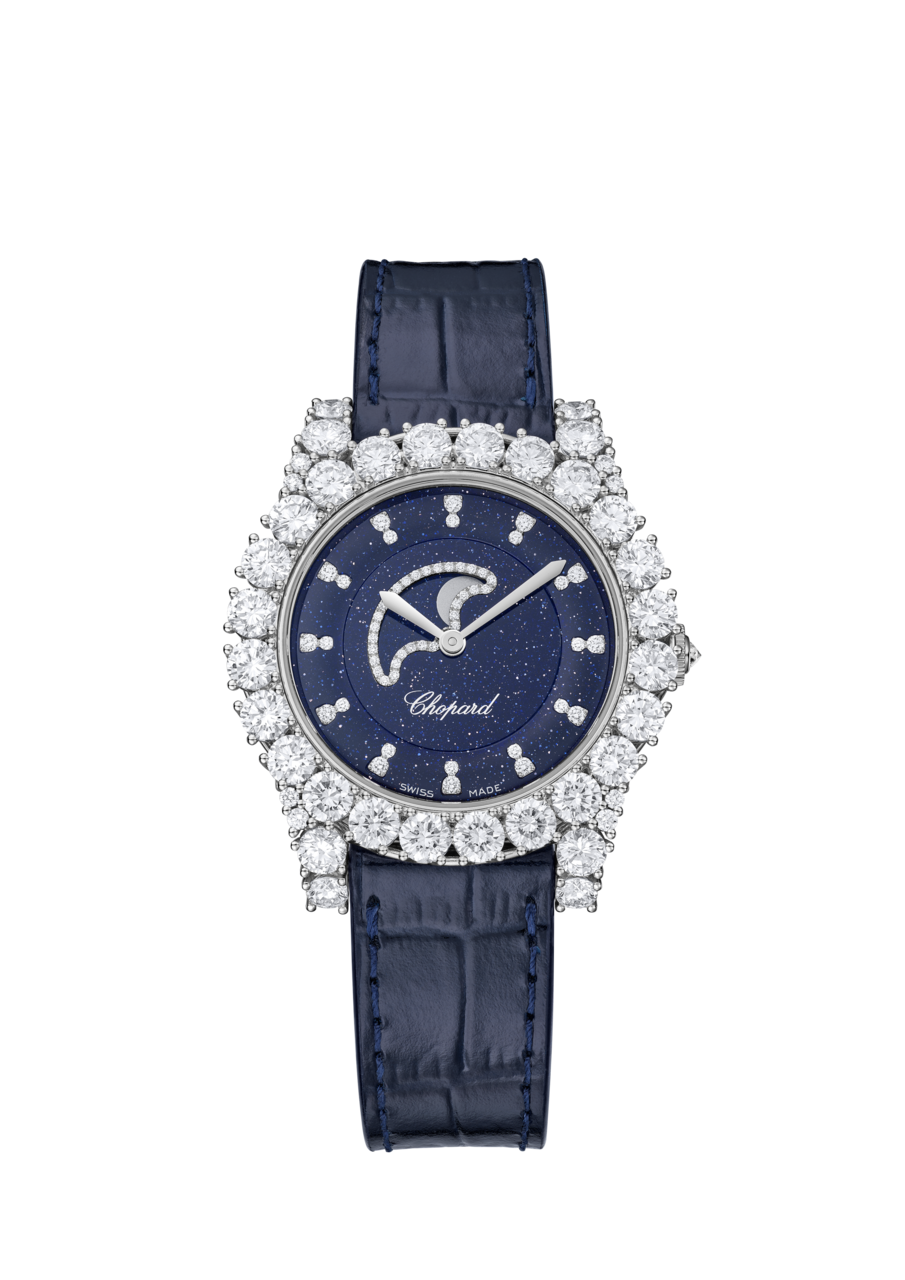 Техническое совершенство и эстетическая утонченность воплотились в новой модели L’Heure du Diamant Moonphase. В центре внимания здесь — индикация фаз Луны, которые отражаются среди искрящихся бриллиантов в отблесках загадочного авантюрина. А внутри модели бьется усложненный новый механизм Chopard Calibre 09.02-C, состоящий из 169 компонентов. При всей своей объемности он очень компактного размера, что позволяет ему идеально вписаться в небольшой корпус изящных женских часов. Авторский почерк знаменитого ювелирно-часового Дома заметен и в закрепке «корона», которую разработал Карл Шойфеле. Именно она создает эффект невидимого кружевного основания, позволяя свету беспрепятственно проходить сквозь камни. Ослепительное свечение гарантировано!