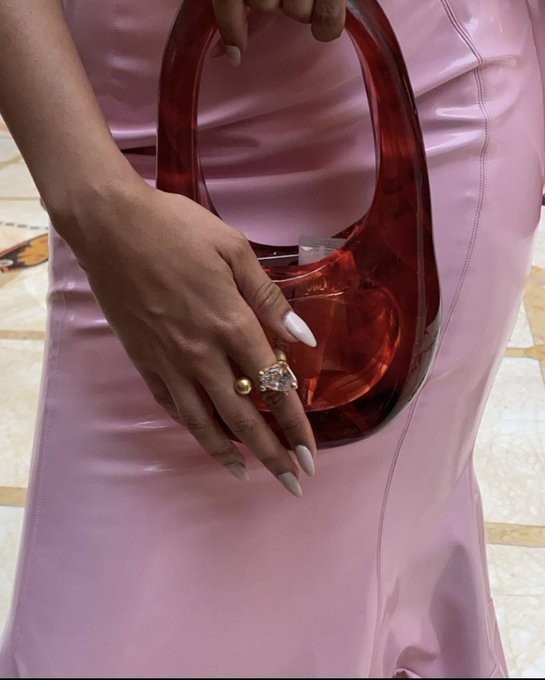 На той же красной дорожке певица Тинаше появилась в латексно-розовом платье GCDS с рубиново-красной сумкой Swipe. В тот вечер был явно звездный час этого волшебного аксессуара.