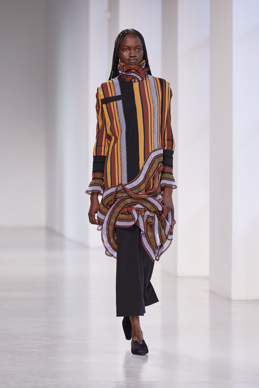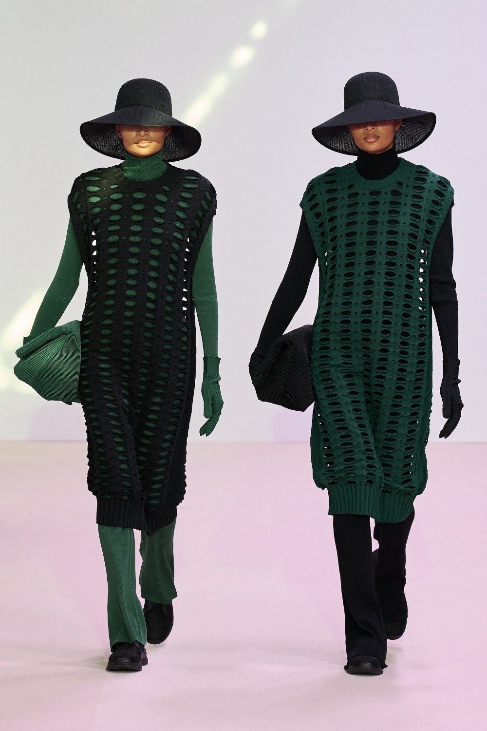 В осенне-зимнем сезоне дизайнер исследует японские корзины и фокусируется на культуре, которая стала популярной в Японии в начале 20-го века. Утонченность, баланс форм и элегантность линий в работах Iizuka Rōkansai послужили главным вдохновением для коллекции. Цветовая палитра изделий остается естественной: от землистых коричневых тонов до цвета хаки с контрастными оттенками черного и темно-синего. Наше особое внимание привлек смелый узор плетения на топах и юбках, который является результатом применения техники плиссировки с использованием узорчатой бумаги.