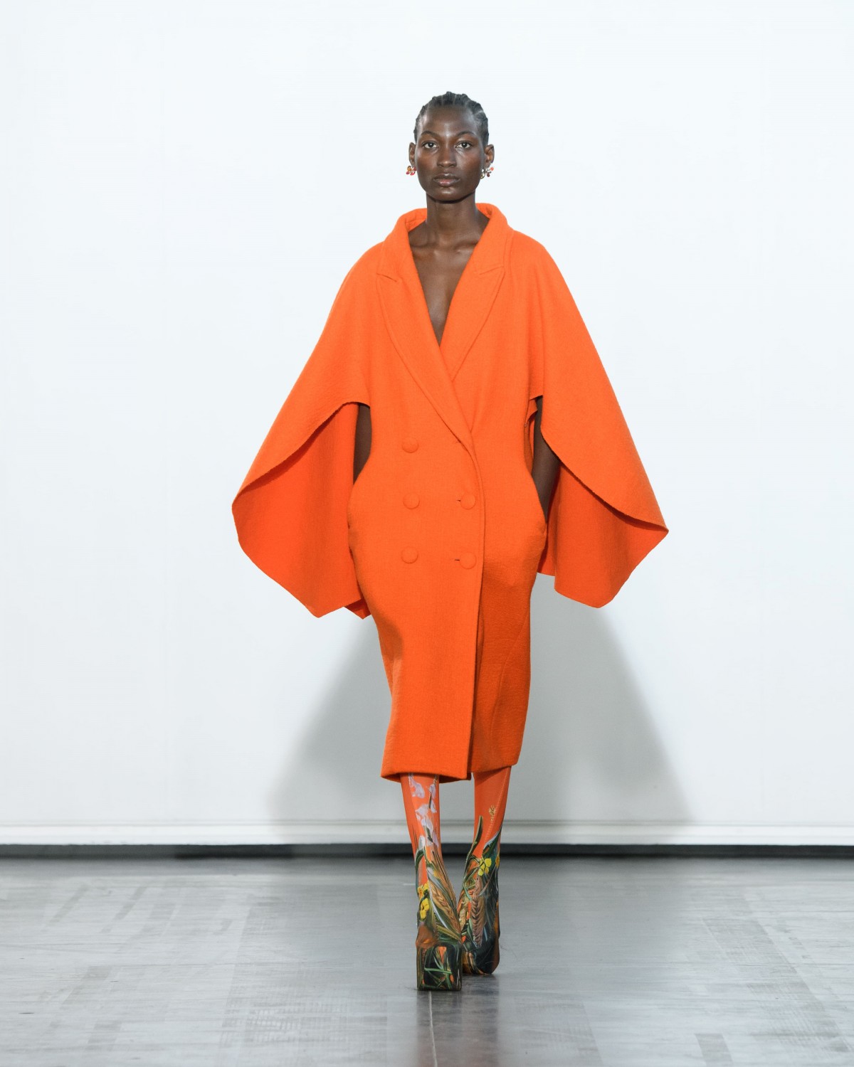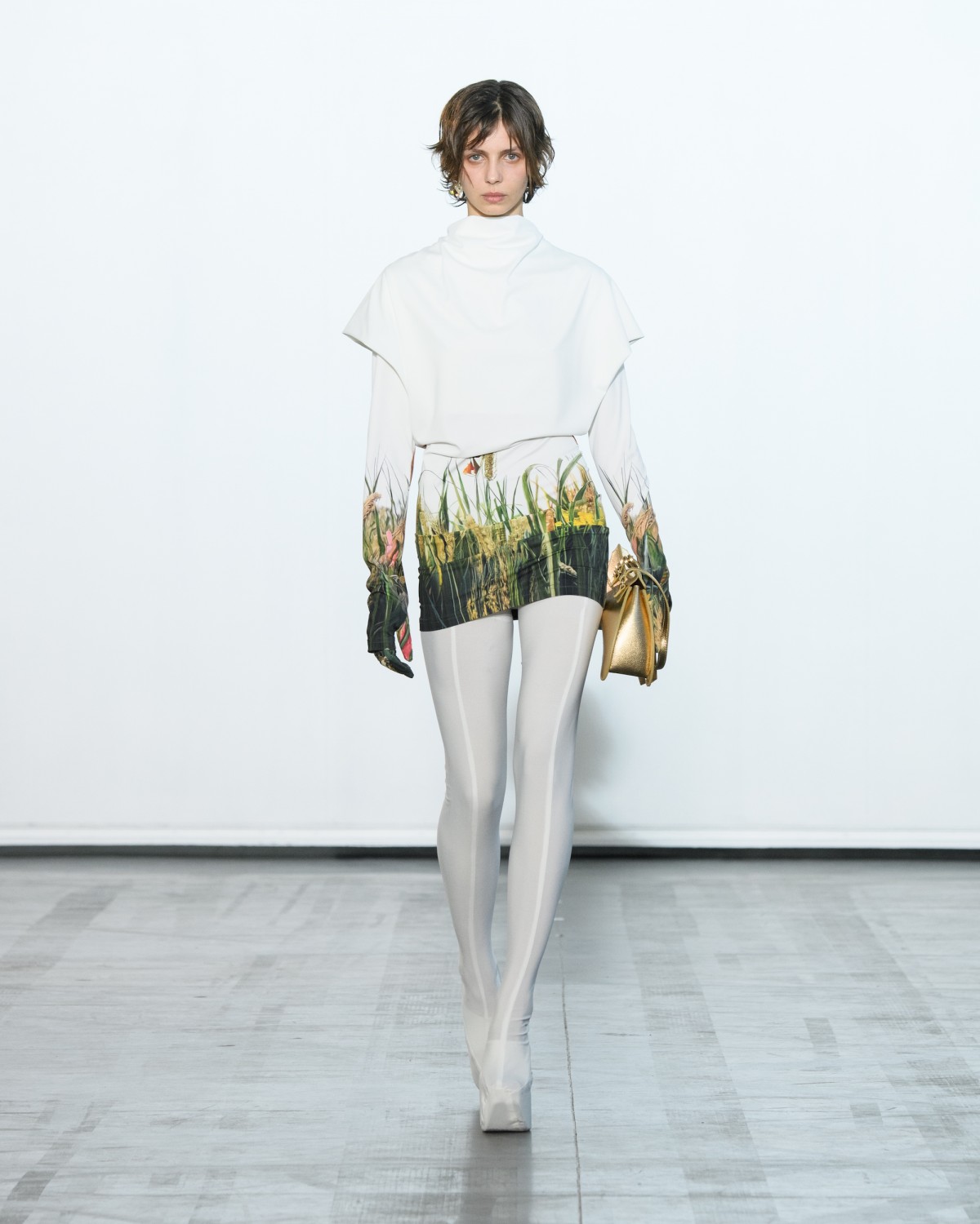 Коллекция Maitrepierre под названием «Время слушать» — это ода природе. Она полностью выполнена из переработанных материалов — так она заставляет нас задуматься о воссоединении с окружающей средой. Дизайнер решил созерцать природу и подчеркнуть гармонию сквозь призму технологий. Принты этого сезона разработаны с помощью использования искусственного интеллекта и компьютерного кодирования. Этот процесс создал оптические иллюзии, вдохновленные растениями. Так, были представлены принты в виде лепестков лилий, которые словно обвивают тела, пальто имитируют листья, полевые цветы распустились на брюках, а костюмы спутываются словно стебли.