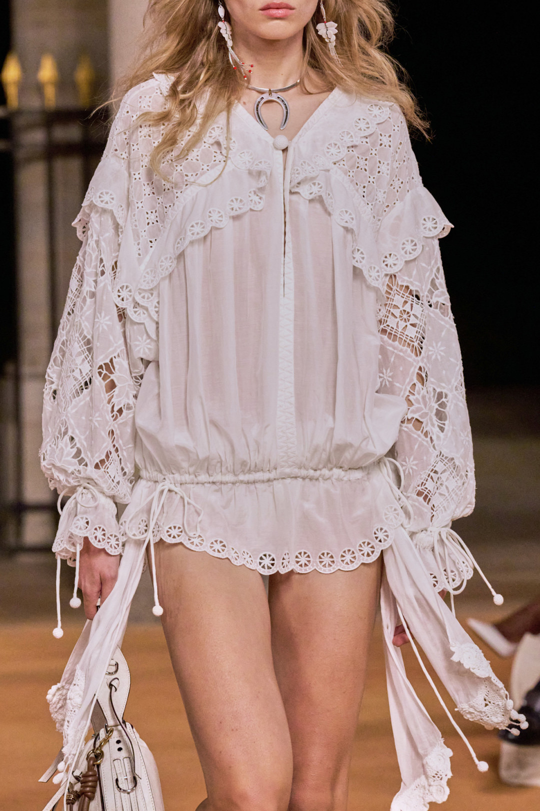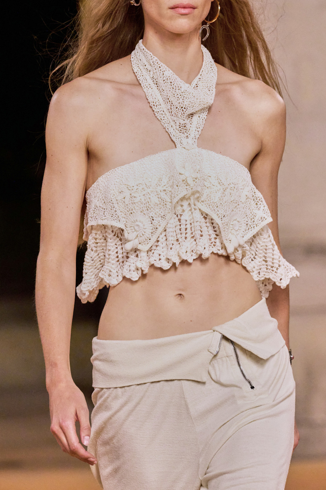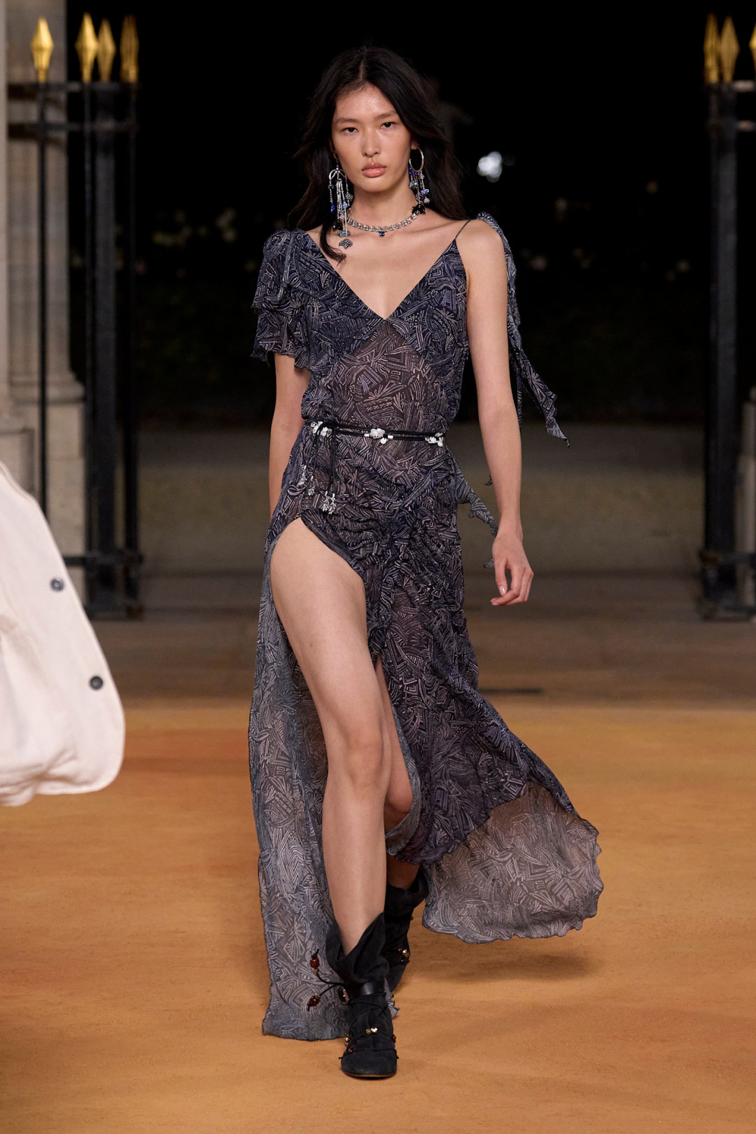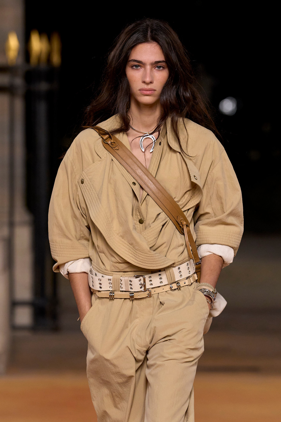 На подиуме Isabel Marant все складывалось в единый рассказ о дороге. Сначала внимание приковывали рубашки на одно плечо с заплатами и карго-брюками с накладными карманами, перехваченными двойными ремнями. За ними появлялись фактурные бомберы и блестящие топы, сияющие, как миражи в знойной пустыне.