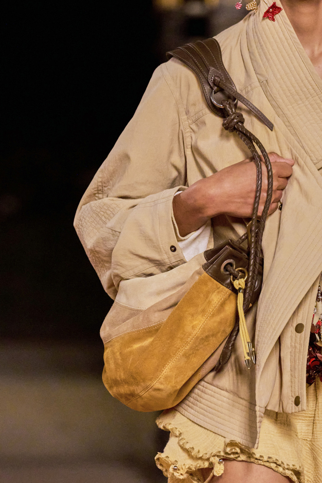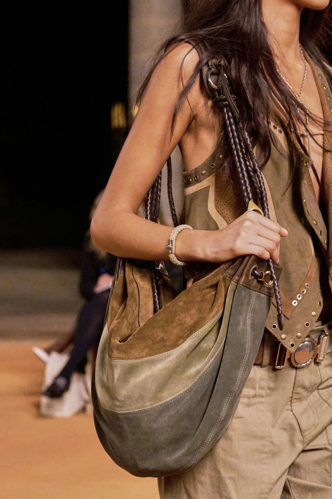 Аксессуары стали продолжением этой кочевой истории. В руках моделей находились замшевые сумки-полумесяцы с золотыми ремешками и вместительные рюкзаки, созданные для дальних дорог. Их легко представить и на спине байкера, летящего по раскаленному шоссе, и в руках пассажира шумного мегаполиса.