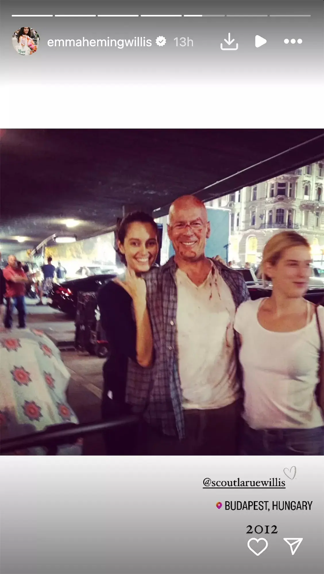 На фото Хеминг позирует с 69-летним Уиллисом и его дочерью Скаут Уиллис, которую он делит с бывшей женой Деми Мур. Эмма также поделилась милым снимком Уиллиса с дочерью Мейбл, которой сейчас 12 лет. На снимке актер держит дочь на плечах, пока она читает книгу.