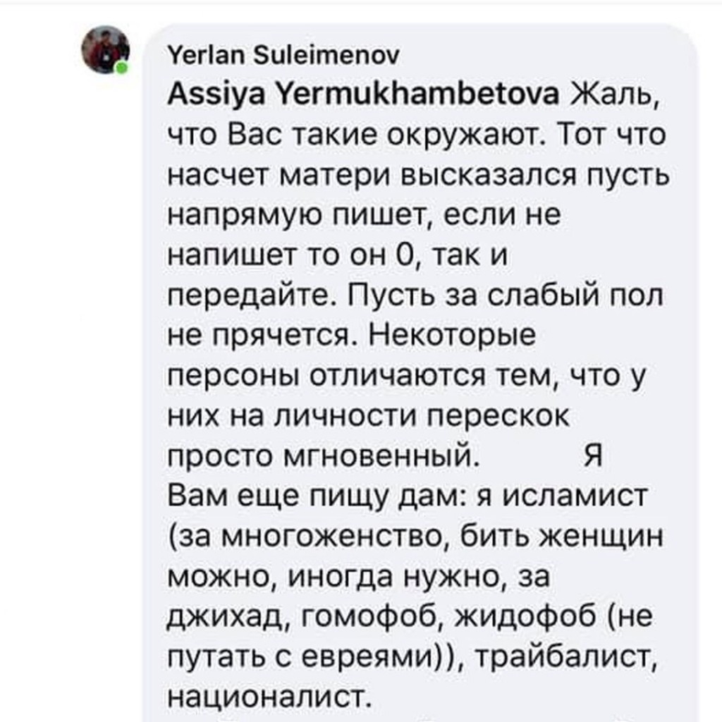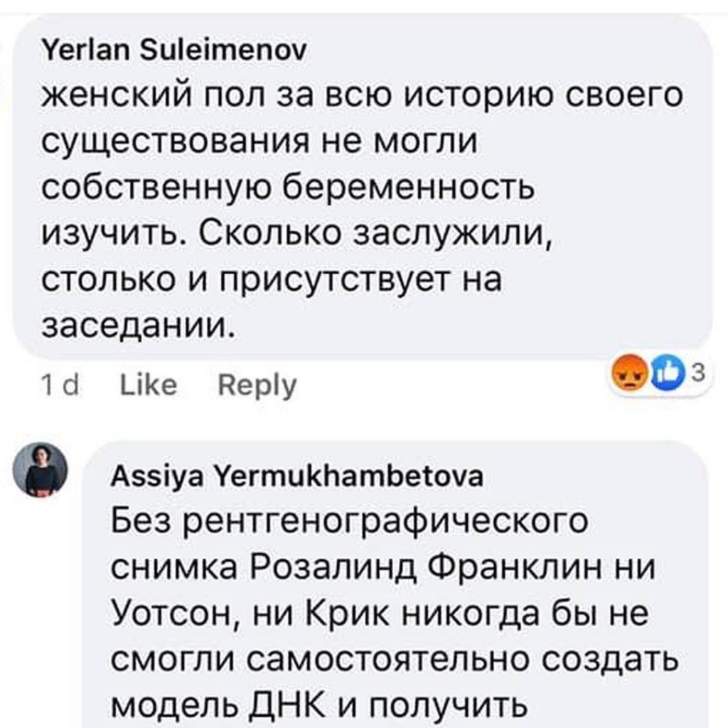 Пару дней назад Асия Ермухамбетова опубликовала на своей странице в Facebook пост о том, что на заседании НСОД, прошедшем 27 мая, вопросы образования обсуждали профессора в основном мужского пола. Этот пост вызвал массу комментариев. Но нешуточный бой разразился после высказывания профессора Евразийского Национального Университета им. Гумилева Ерлана Сулейменова: