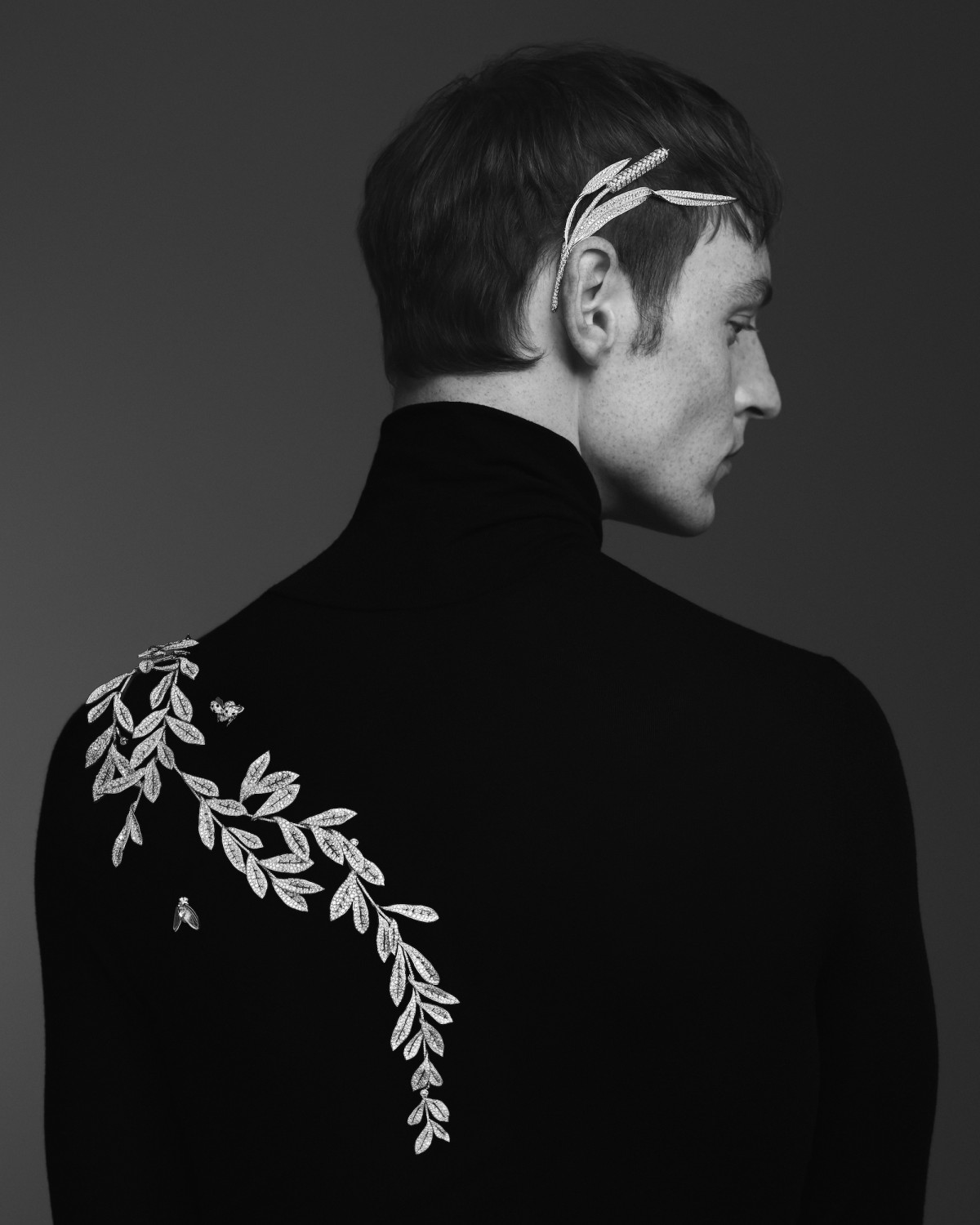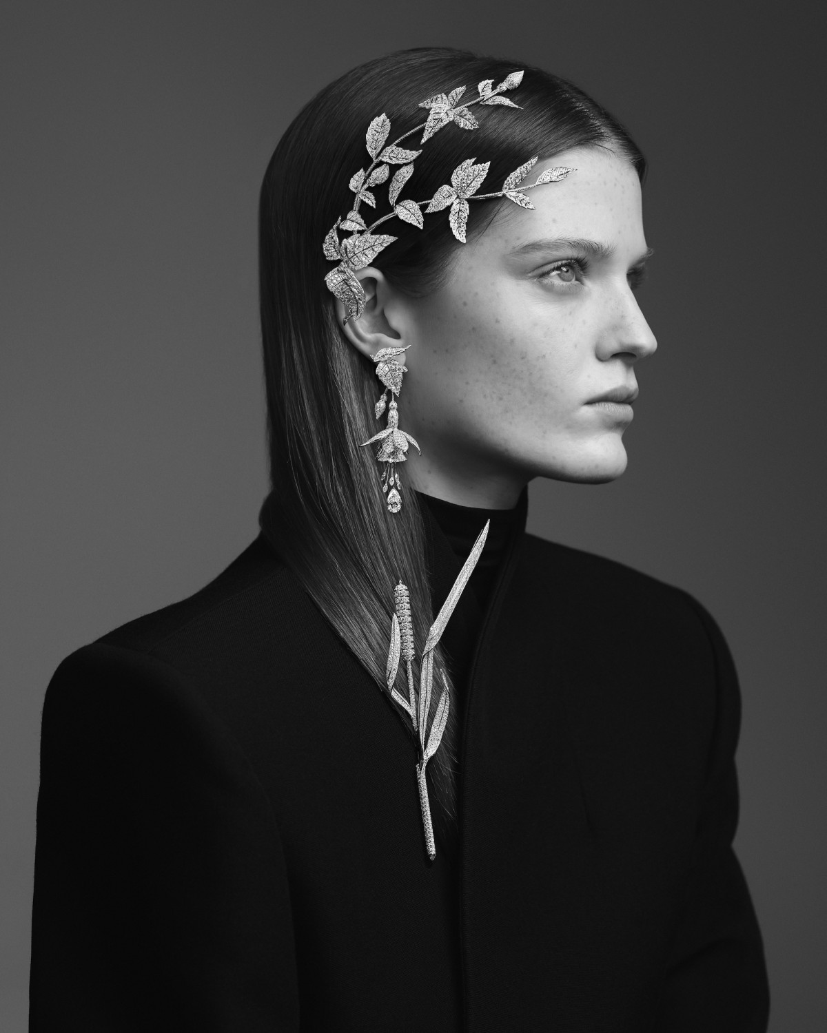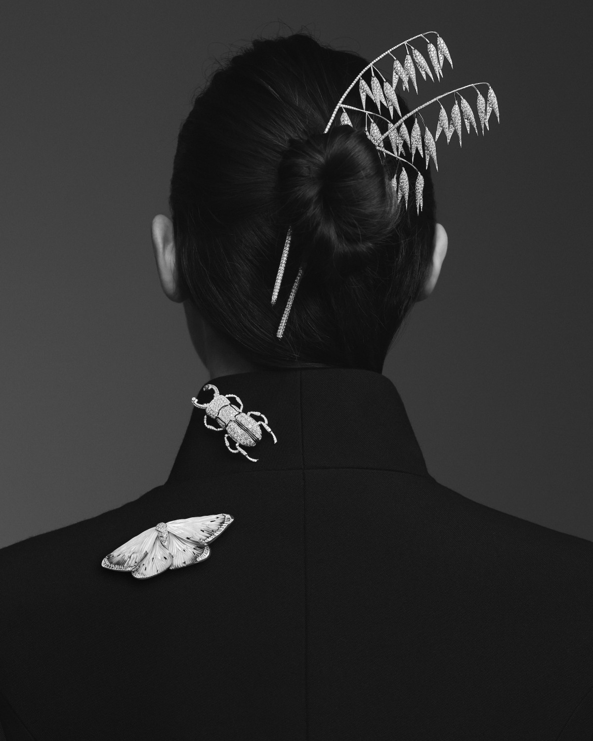 В этом сезоне для брошей была разработана инновационная система крепления, которая надежно фиксирует украшения, обеспечивая комфорт, а также техника огранки паве, которая придает камням блеск, закрепляя их на металлических стеблях. Это создает иллюзию, будто драгоценные камни естественным образом прорастают из растения.